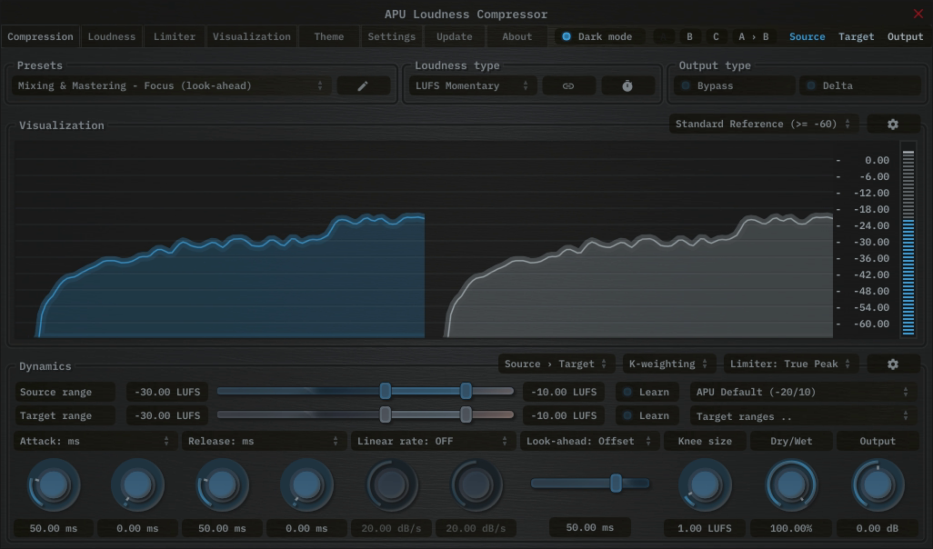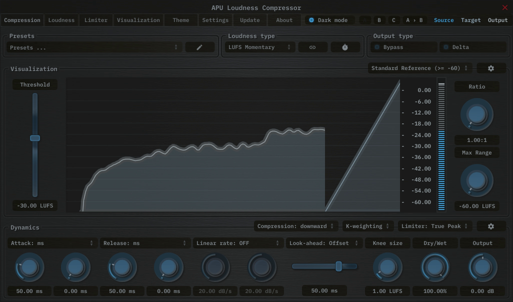 One of the key features of this compressor is its support for a variety of loudness types. The compressorâs detection circuitry can be configured to use either