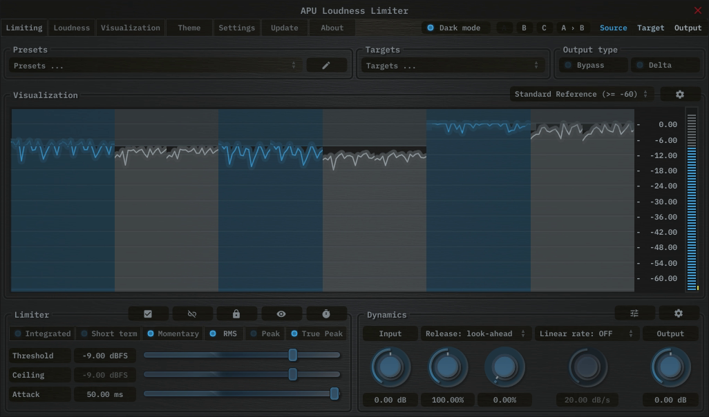The APU Loudness Limiter is a tool designed for loudness-based limiting. Its core function is to perform limiting across multiple loudness measurement types simultaneously, including modern LUFS standards (Integrated, Short-term, Momentary) and traditional metrics (RMS, Peak, and True Peak). The True Peak detection is designed to account for inter-sample peaks.