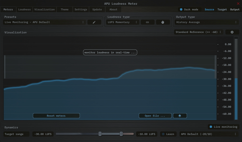 APU Loudness Meter is a free loudness analysis plug-in supporting a variety of loudness types and metering modes with clean adjustable visuals. You can monitor in real-time using live history and histogram views, or analyze an entire file to view the overall statistics and histograms.